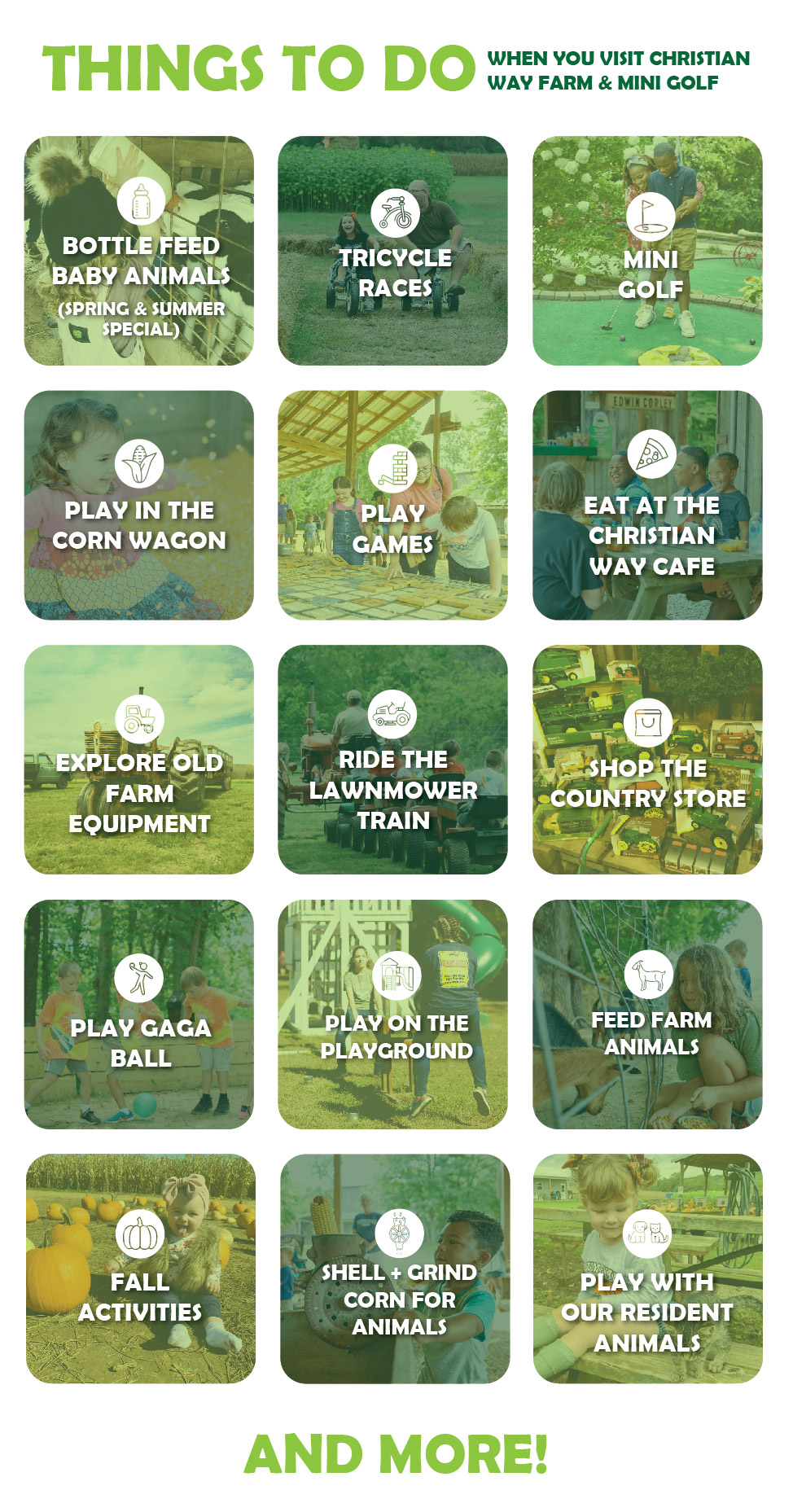 Christian Way Farm and Mini Golf features hayrides, a playground, Gaga ball, a tricycle arena for friendly competitions(made out of hay!), giant Scrabble & giant Jenga. For the historian or farm equipment aficionado, come learn about equipment that dates back to the early 1900’s during your agritourism adventure. In the Spring, you’ll have the chance to meet new farm animal babies! In the Fall, enjoy a pick-your-own pumpkin patch and other Fall activities like our corn maze. Christian Way Farm is family fun for all ages. Toddler activities, things to do with kids outdoors, all the way to adult fun outdoors can be found on our Hopkinsville farm.
